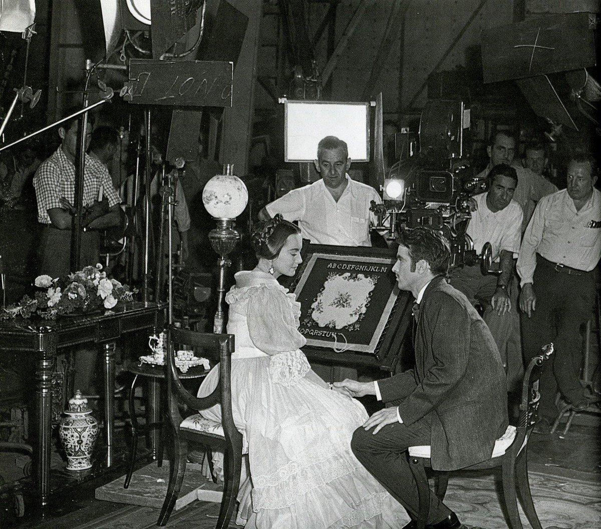 William Wyler directs Olivia de Havilland and Montgomery Clift in The Heiress. |